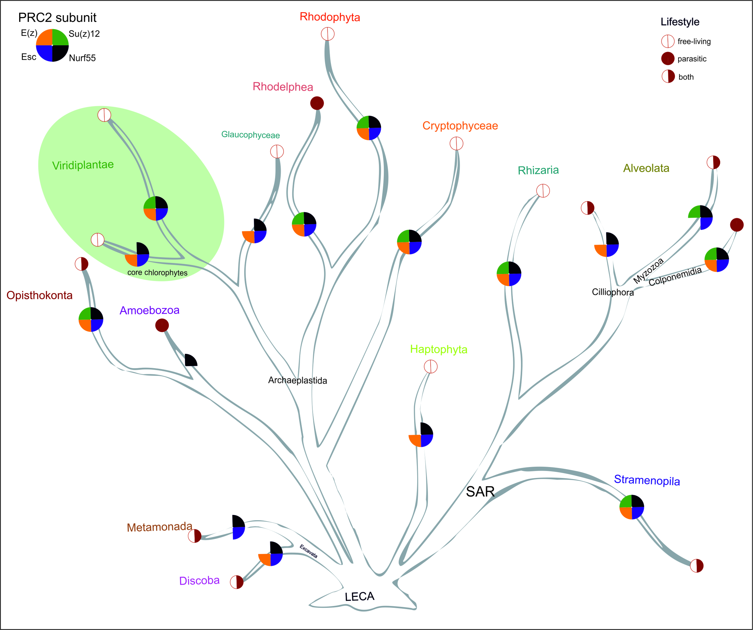 PRC2 is well conserved in the evolution of eukaryotes. In our work, we address the question of how the composition and function of PRC2 evolved in the green lineage and also in other eukaryotic supergroups. Recently, we developed an automated computational pipeline "PcG-finder" to identify PRC2 protein components and reconstruct the phylogeny of PRC2 core subunits in all eukaryotic lineages (Sharaf et al. 2022). This opened up intriguing new questions regarding the evolution of the protein complex composition and function that we are now addressing, mainly using the green lineage as an "experimental playground". |